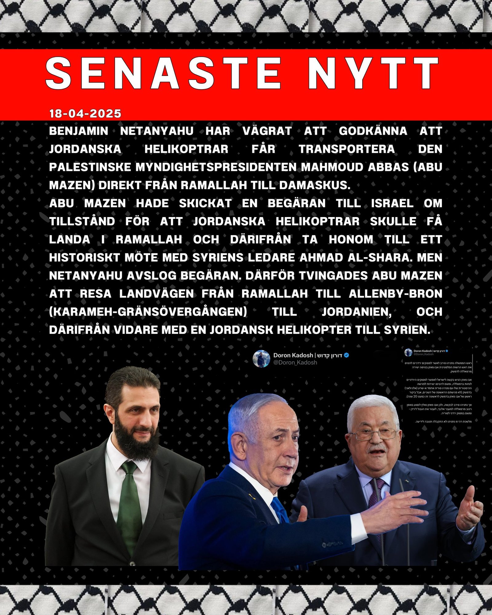 18 apr, 2025 Senaste nytt Benjamin Netanyahu har vägrat att godkänna att jordanska helikoptrar får transportera den palestinske myndighetspresidenten Mahmoud Abbas (Abu Mazen) direkt från Ramallah till Damaskus.