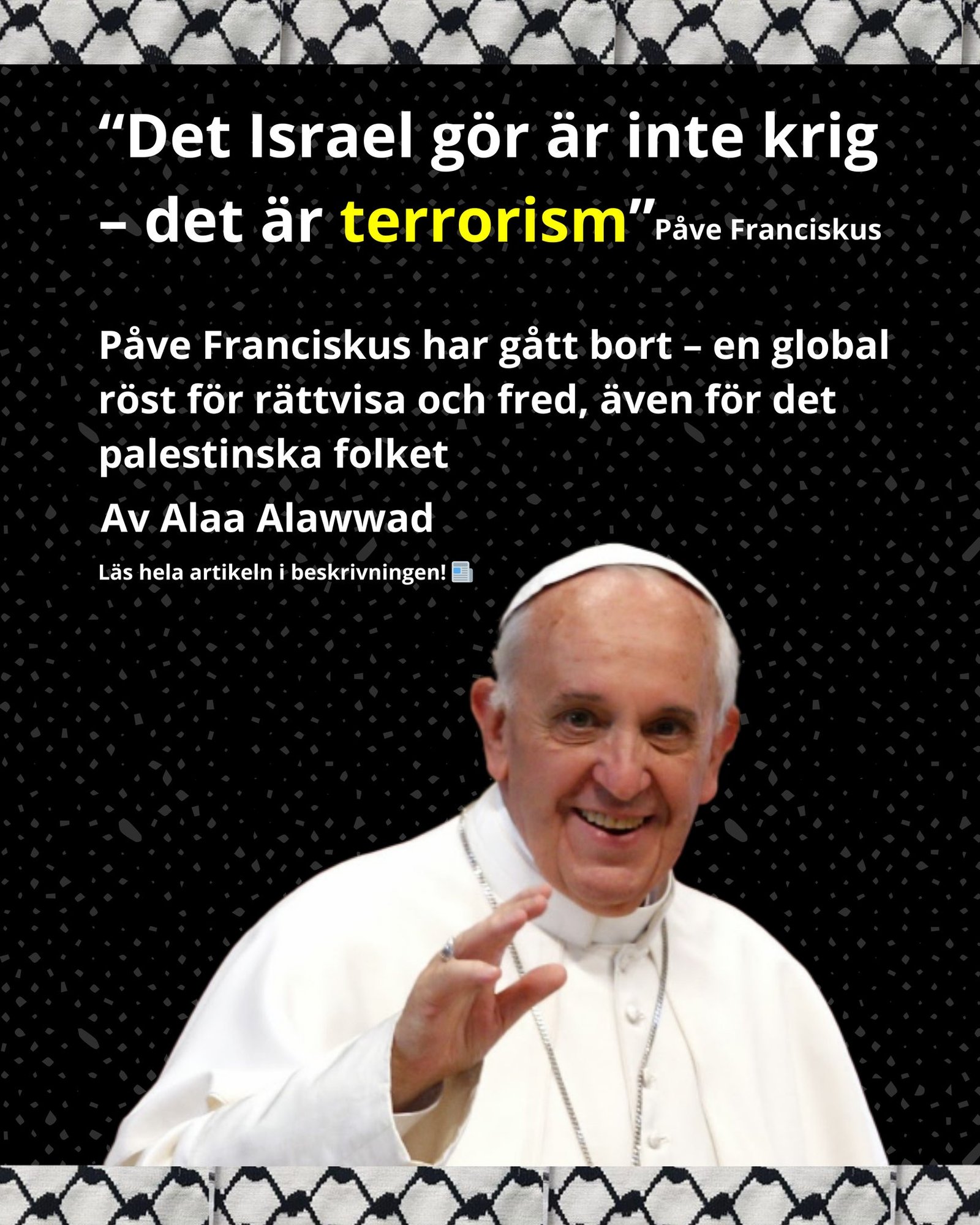 21 apr, 2025 inlägg Påve Franciskus har gått bort – en global röst för rättvisa och fred, även för det palestinska folket