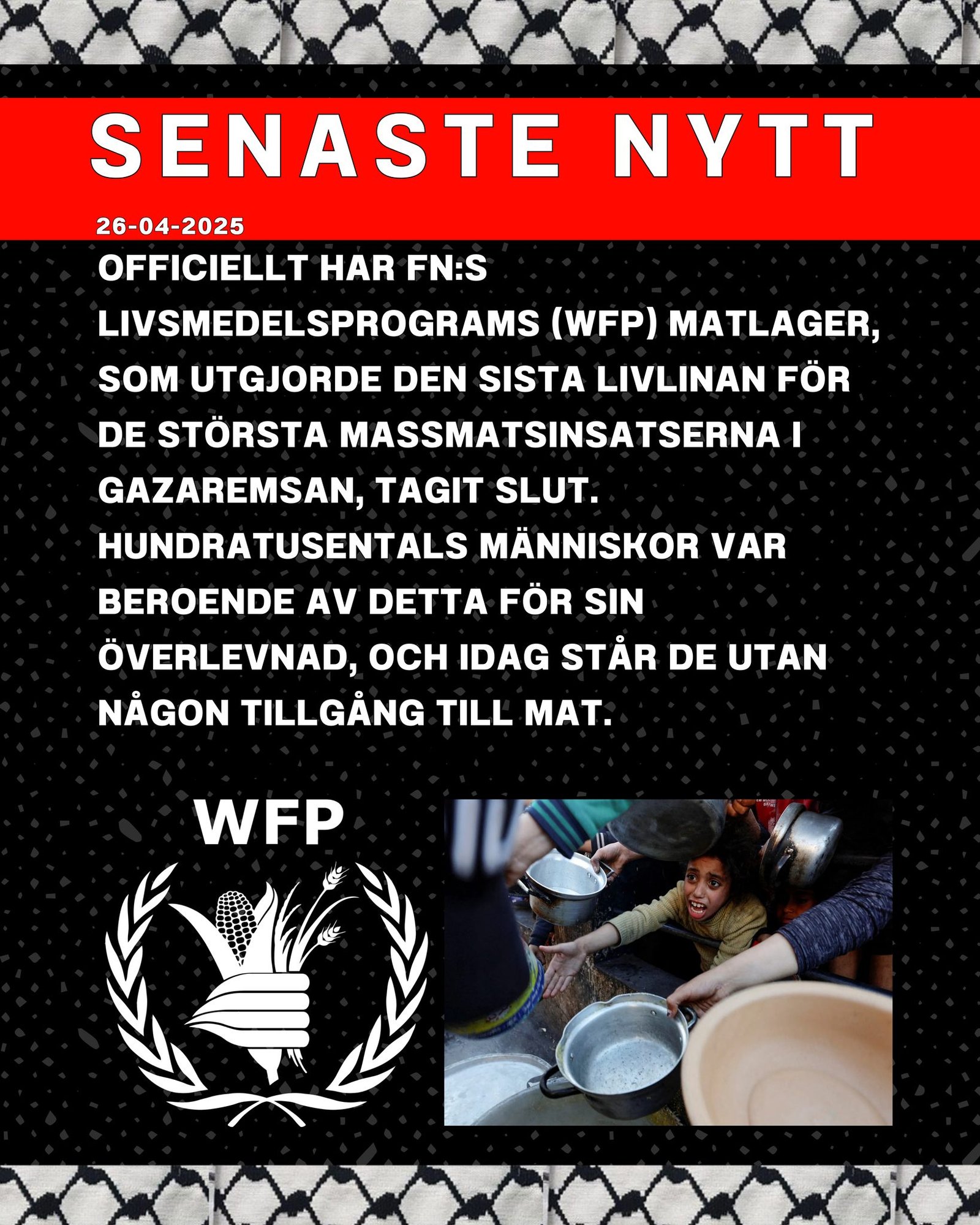 26 apr, 2025 Senaste nytt Officiellt har FN:s livsmedelsprograms (WFP) matlager, som utgjorde den sista livlinan för de största massmatsinsatserna i Gazaremsan, tagit slut.