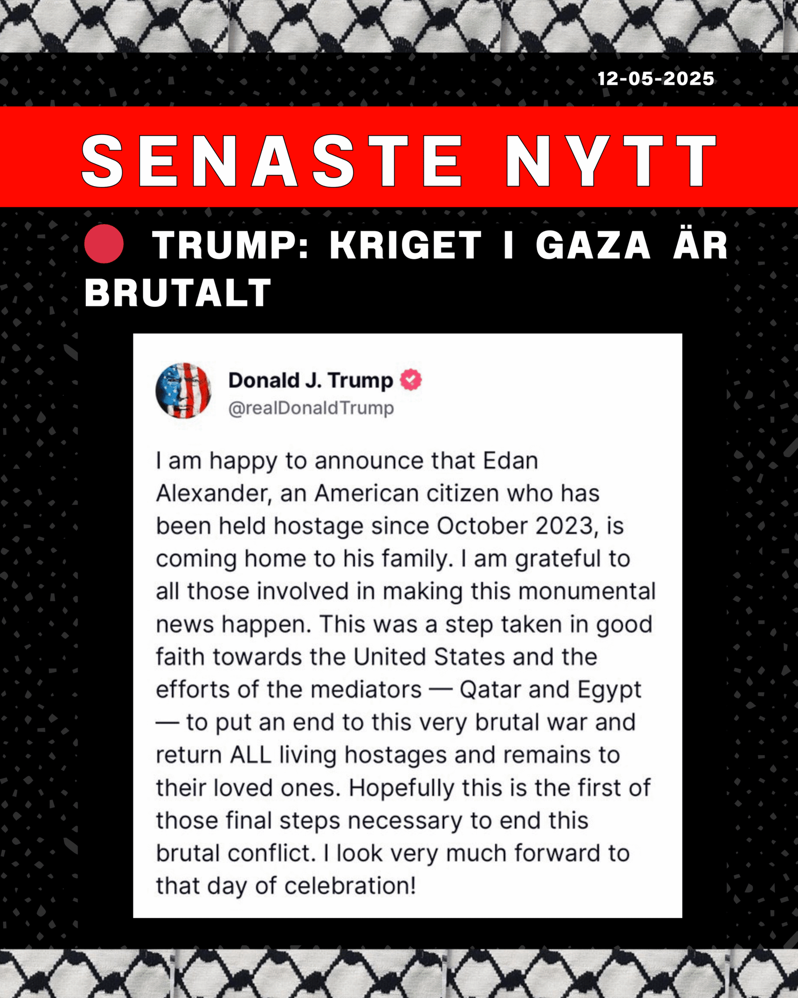 12 maj, 2025 Senaste nytt Donald J. TrumpJag är glad att kunna meddela att Edan Alexander, en amerikansk medborgare som har hållits som gisslan sedan oktober 2023, är på väg hem till sin familj.