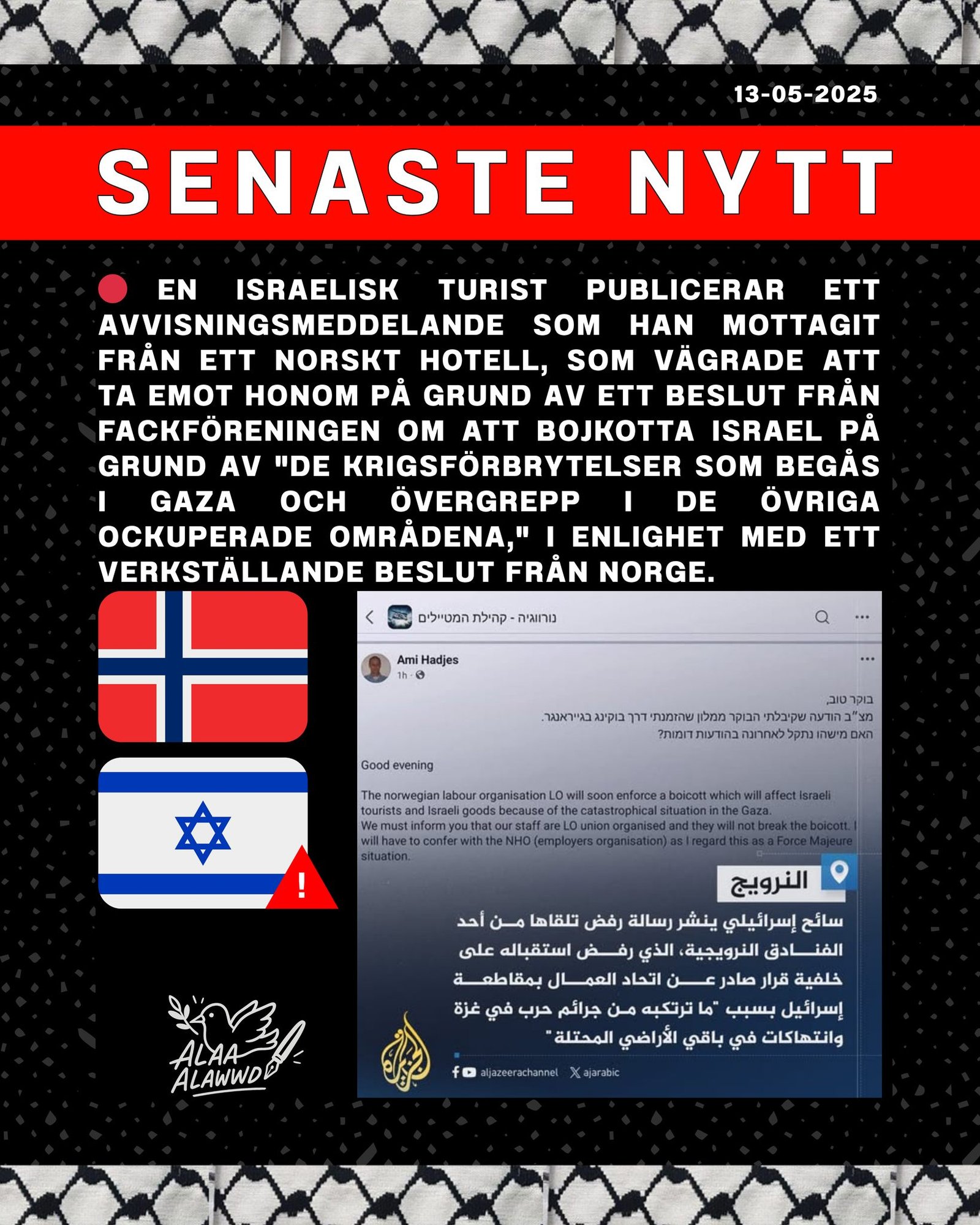 13 maj, 2025 Senaste nytt En israelisk turist publicerar ett avvisningsmeddelande som han mottagit från ett norskt hotell