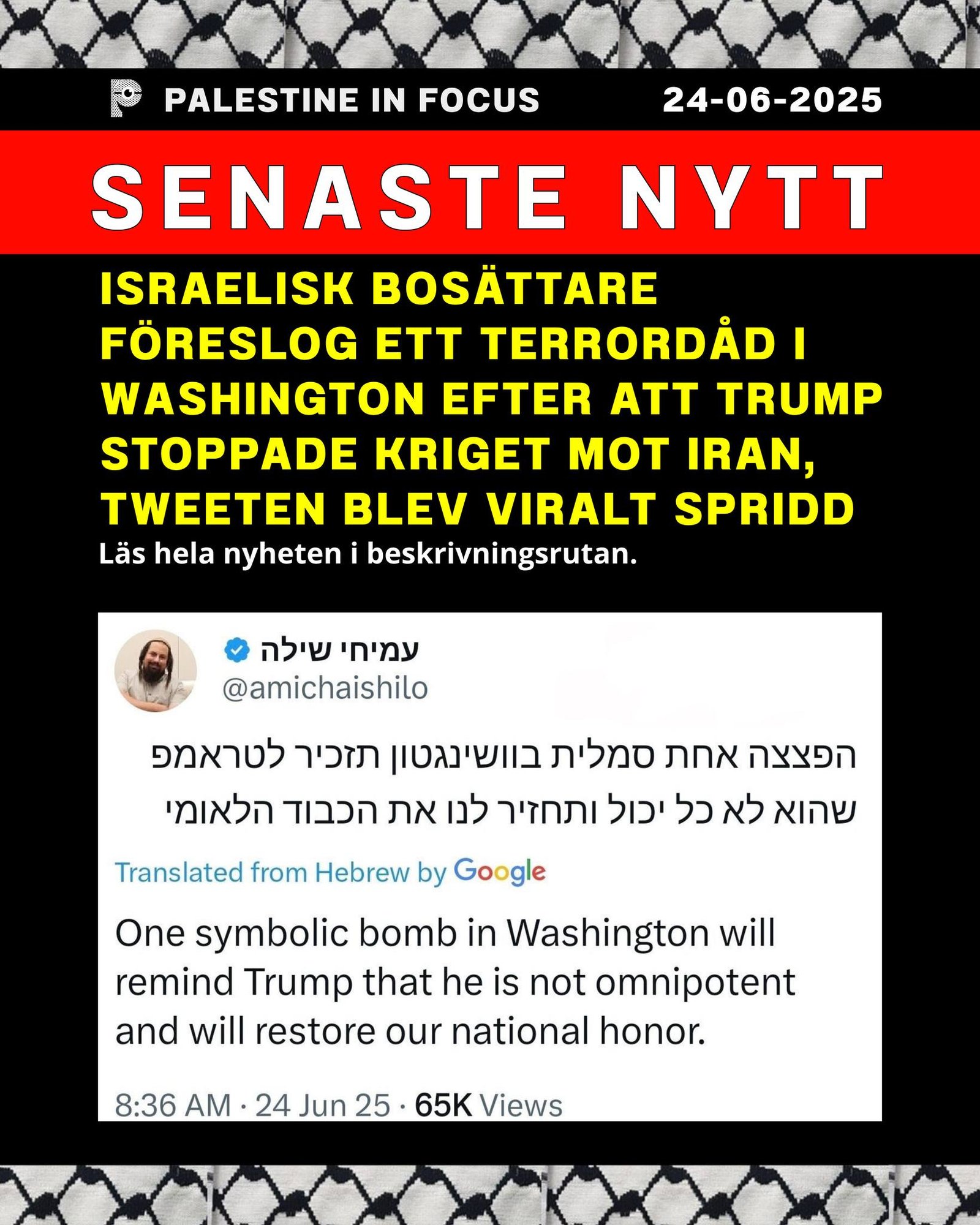 24 jun, 2025 Senaste nytt Israelisk bosättare föreslog ett terrordåd i Washington efter att Trump stoppade kriget mot Iran, tweeten blev viralt spridd
