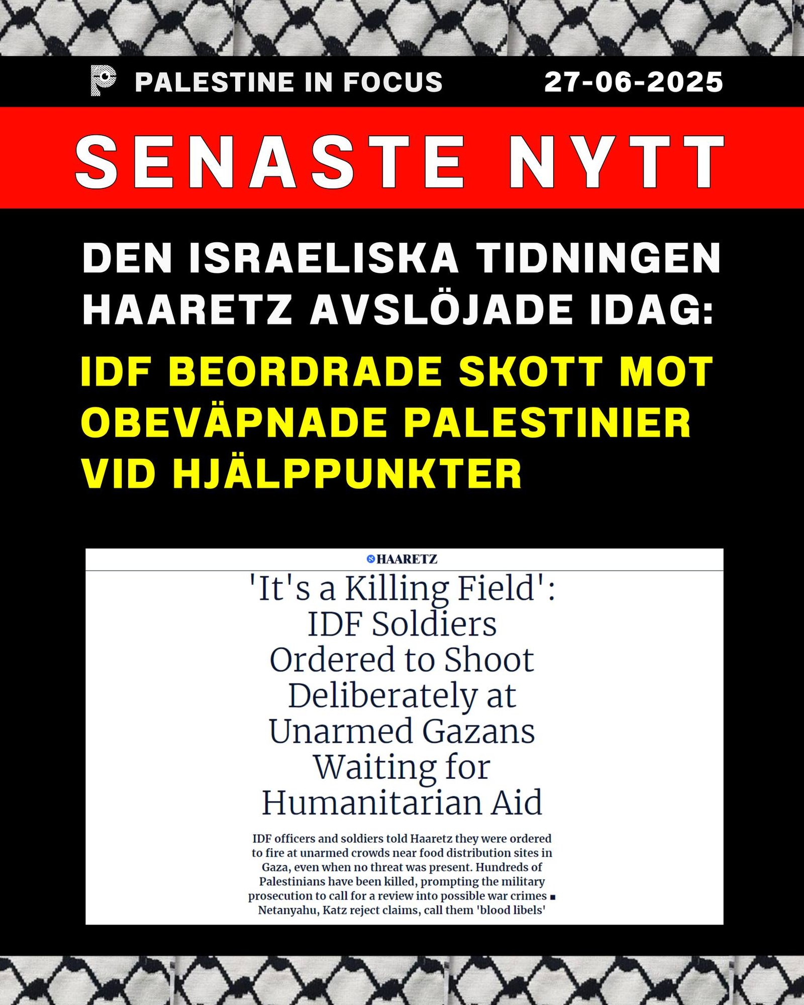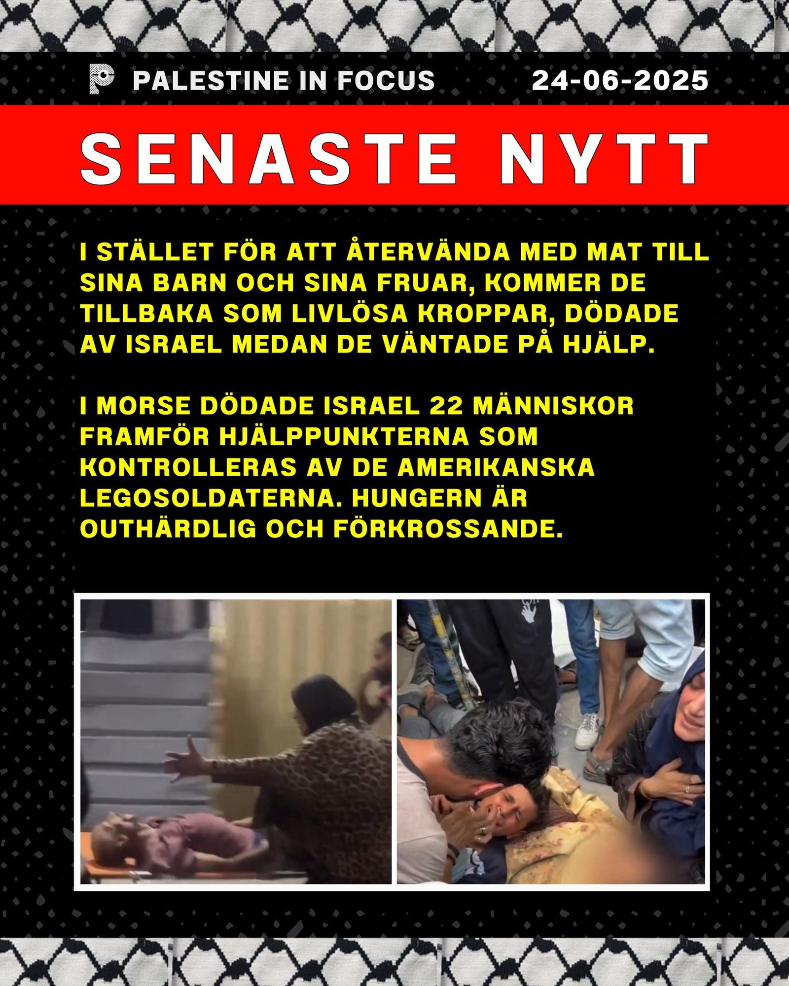 24 jun, 2025 Senaste nytt I stället för att återvända med mat till sina barn och sina fruar, kommer de tillbaka som livlösa kroppar, dödade av Israel medan de väntade på hjälp.