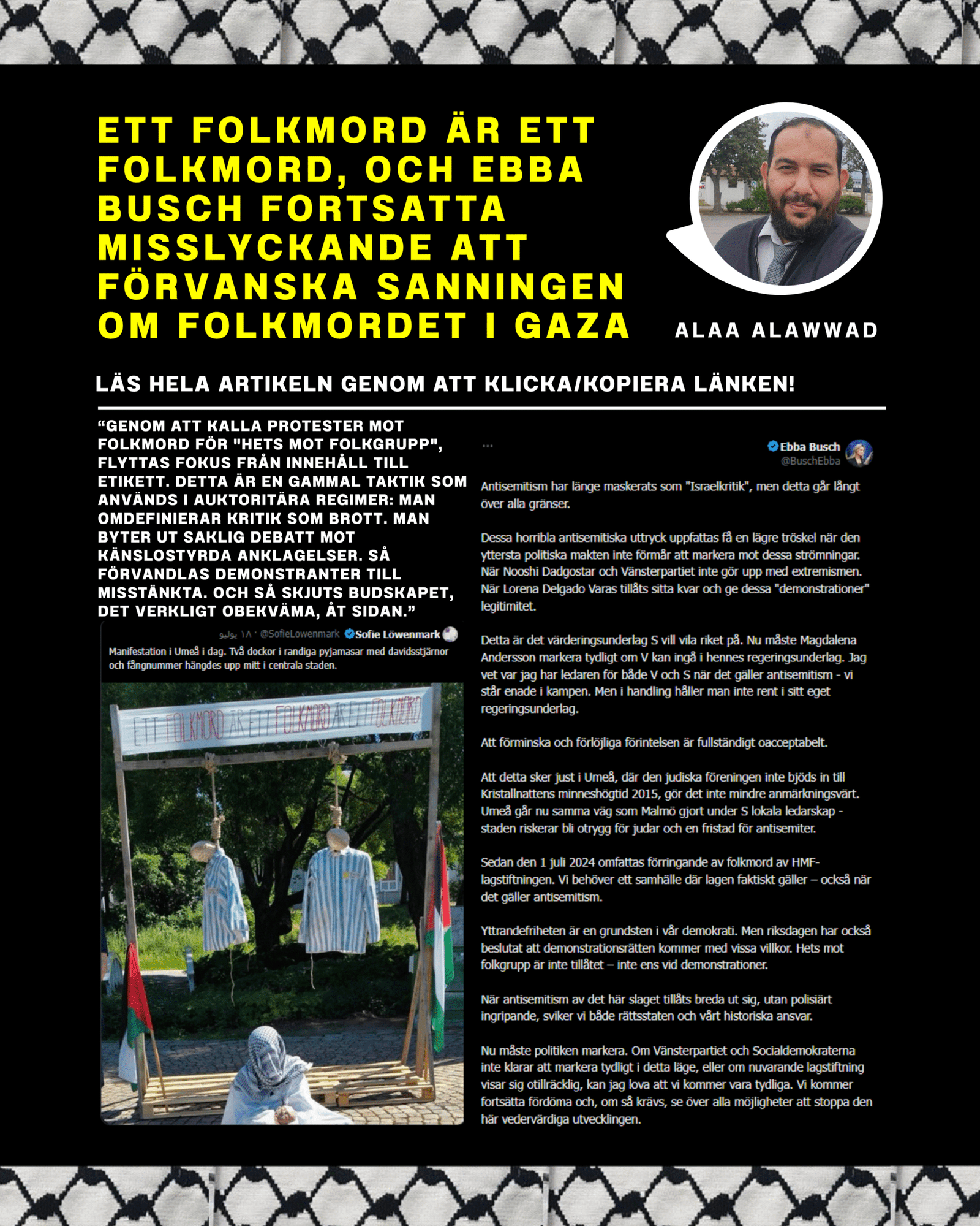 19 jul, 2025 Artikel Ett folkmord är ett folkmord, och Ebba busch fortsatta misslyckande att förvanska sanningen om folkmordet i Gaza
