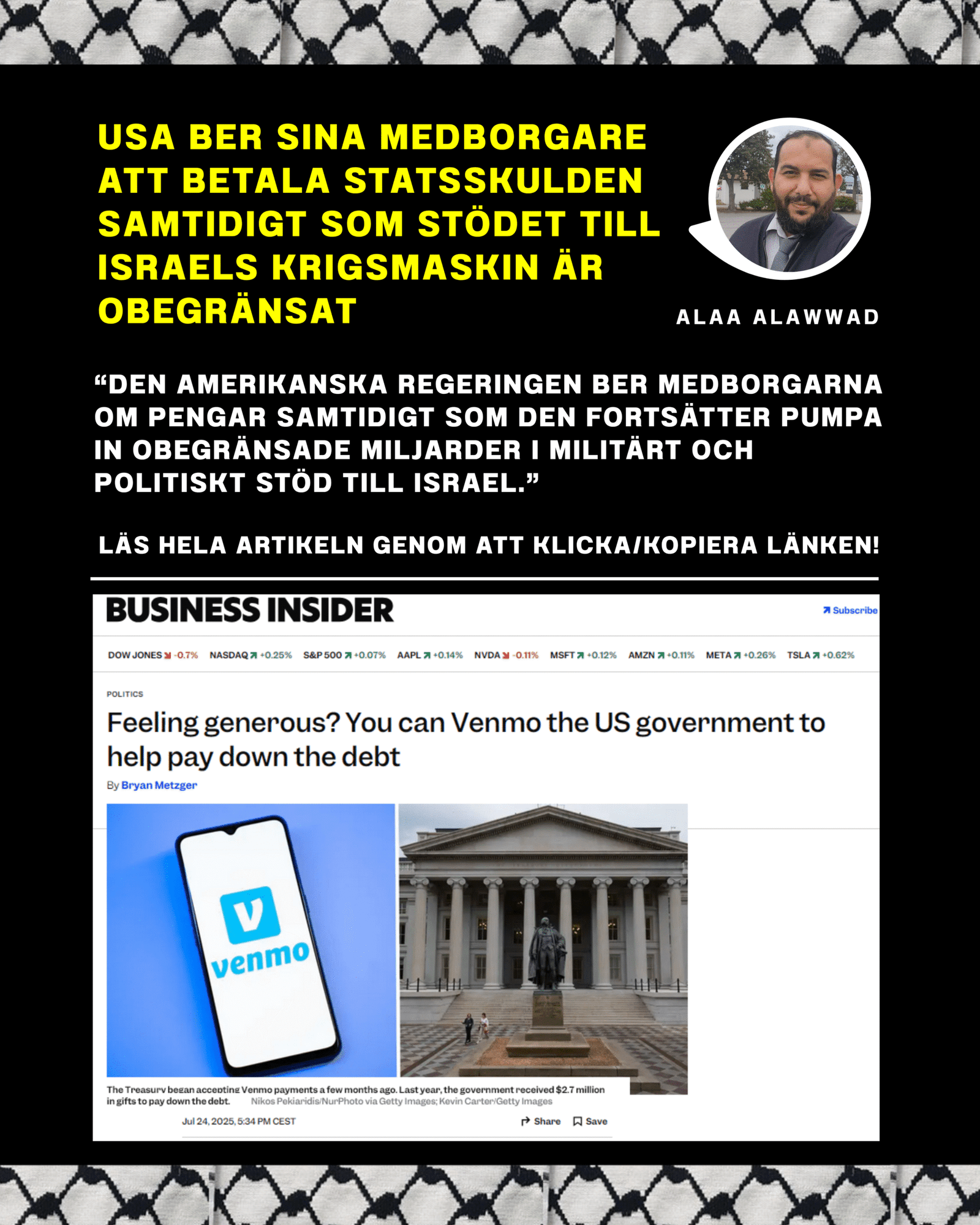 25 jul, 2025 Artikel USA ber sina medborgare att betala statsskulden – samtidigt som stödet till Israels krigsmaskin är obegränsat