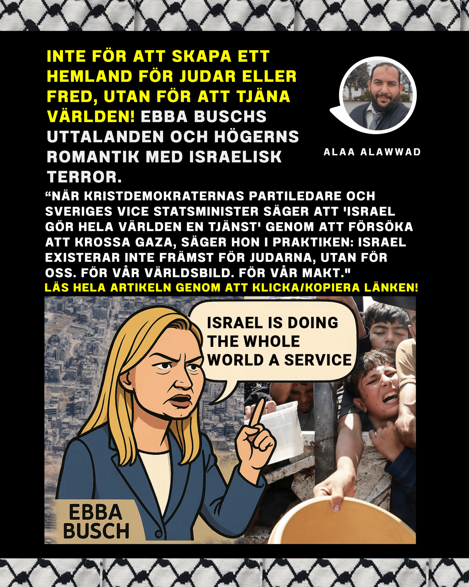 6 aug, 2025 Artikel Inte för att skapa ett hemland för judar eller fred, utan för att tjäna världen! Ebba Buschs uttalanden och högerns romantik med israelisk terror.