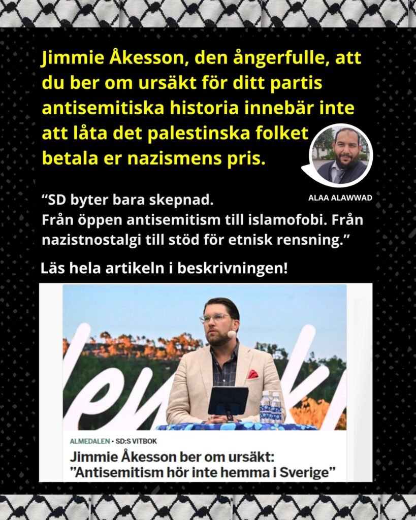 Jimmie Åkesson, den ångerfulle, att du ber om ursäkt för ditt partis antisemitiska historia innebär inte att låta det palestinska folket betala er nazismens pris.