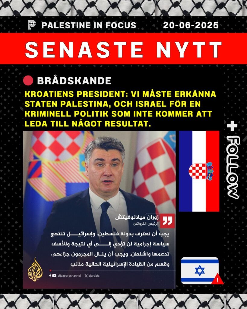 - Kroatiens president: Vi måste erkänna staten Palestina, och Israel för en kriminell politik som inte kommer att leda till något resultat.