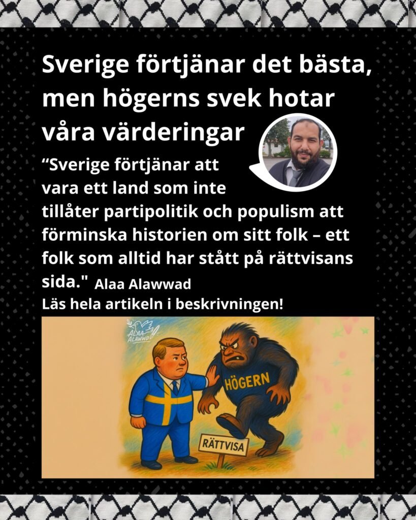 Men något har förändrats. Under de senaste åren har högerpartier i Sverige målmedvetet urholkat dessa värderingar. Genom att sprida misstänksamhet, förenkla komplexa konflikter och blunda för folkrättsbrott, har de bidragit till att försvaga Sveriges röst för rättvisa. De har velat måla om bilden av Sverige – från en röst för fred och mänskliga rättigheter till ett land som tiger, eller ännu värre, som försvarar förtryck.